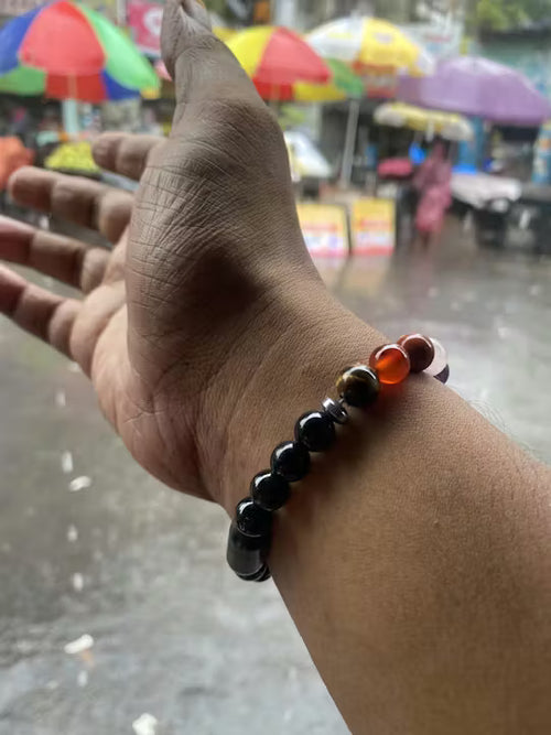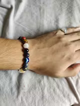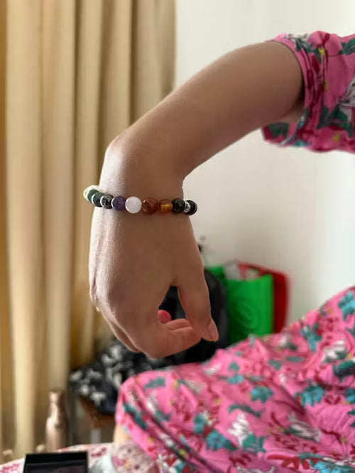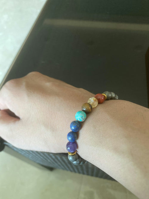 Answer 1: The bracelet is crafted from a combination of vibrant natural chakra stones and sleek black beads, ensuring both aesthetic appeal and durability.