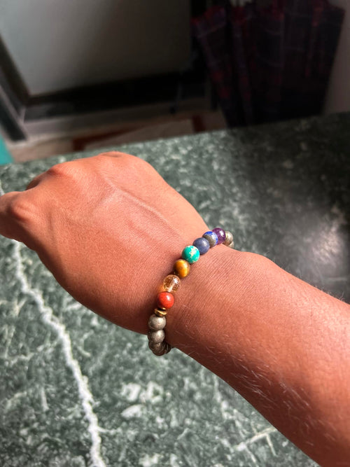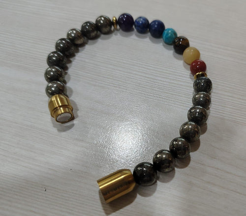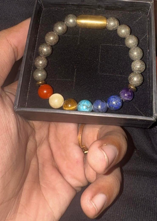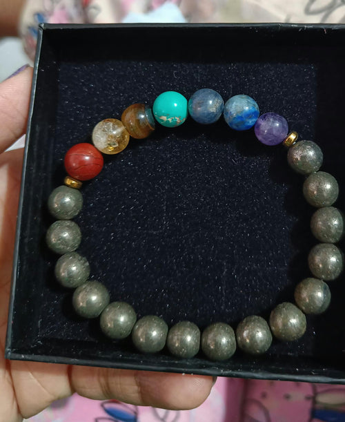 - Made of 7 Chakra beads highlighted by a striking line of Pyrite, each believed to have its own unique healing properties.